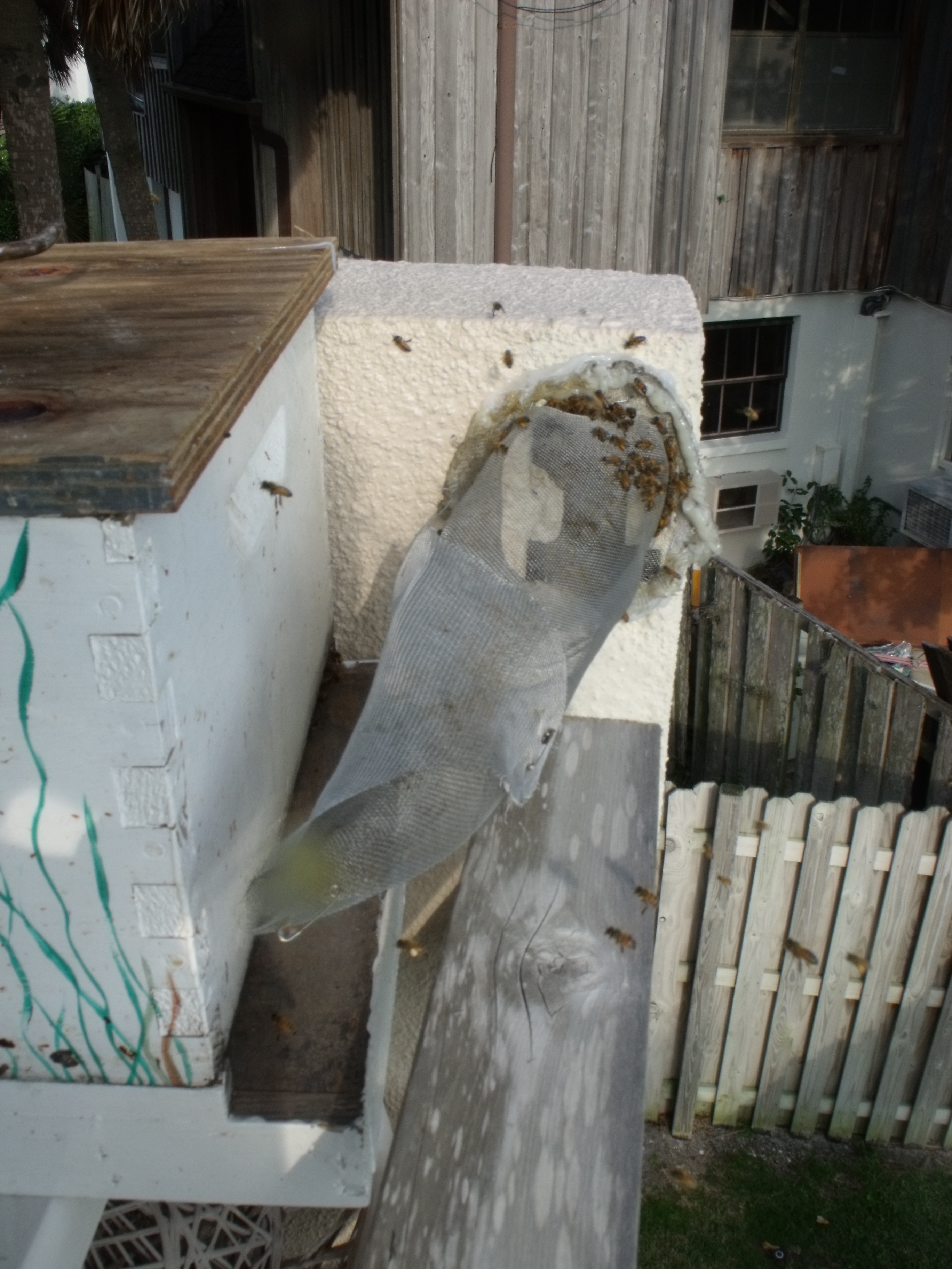 I got a call from St. Pete Beach about a swarm that had moved into a wall and the owners didn’t want to kill the bees so they asked me to take them out. Since the colony is in a location where I can silicon caulk up all the holes except one I was able to set up what we call a trap-out. Over the one entrance I have left I put a cone made of screen.