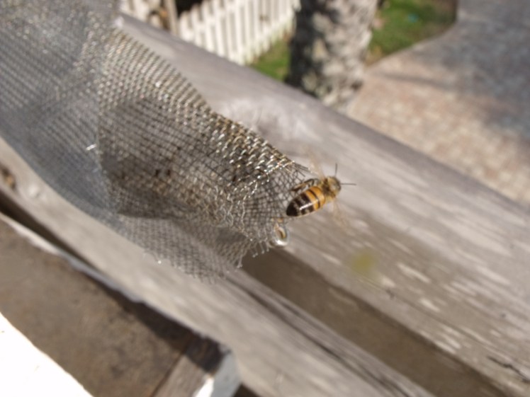 The bees come out to go foraging and walk to the end of the cone to leave their home. When they return they go back to the entrance they are used to and find it is covered with the wide end of the screen cone and can’t figure out how to get back in.