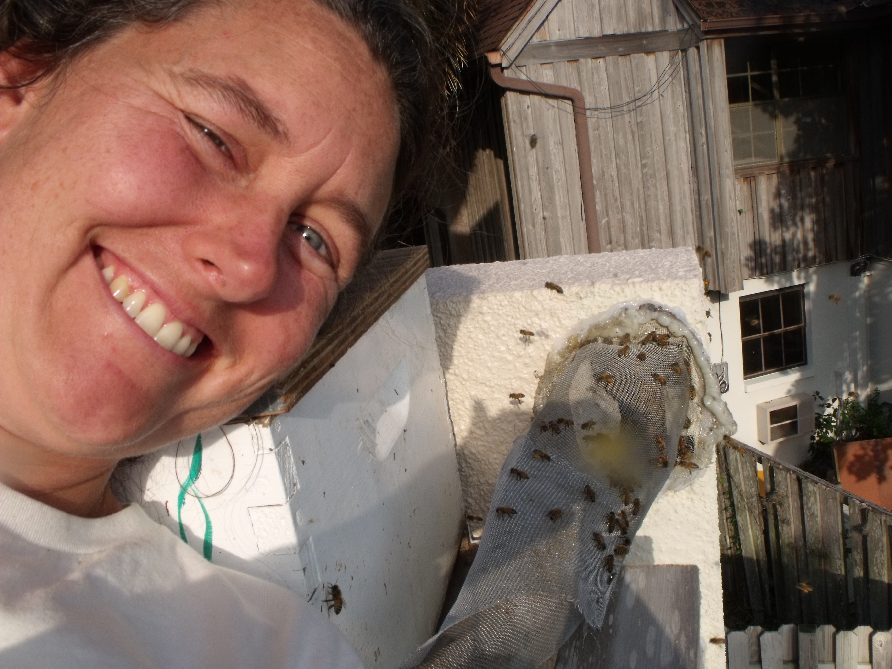 I put a box with a frame of eggs and baby bees (called brood) by the door. When the foraging bees come home and can’t get in their hive they smell the brood and go into my box. There they will realize there is no queen and will begin to raise one, which takes 16 days until she emerges as a bee and another week or so before she is mated and laying eggs. In the meantime the hive in the wall is emptying out. Eventually they will all be gone, the queen there may decide to leave with anyone left. After about 6 weeks the hive in the wall will be empty, all the honey there will have been consumed and I can block it up and take the box, which should have a new queen and be doing well, to an apiary. You must check these regularly to be sure the cone has not gotten blocked with a dead bee and, for large hives, to be sure the box you left is not completely full, in which case you’d need to put another box there.