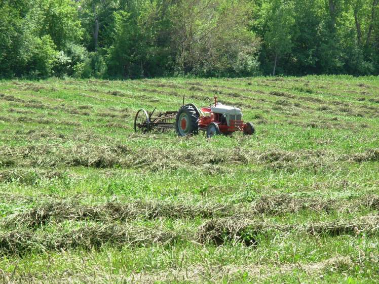 Today I hopped on the Ford tractor, same engine as the model T they tell me and runs like a charm.  Now, this thing is cared for by a good farm mechanic but can you imagine a vehicle made today being put to work in 80 years?  I love my 17-year-old Honda but no way.  Anyway, the Ford started right up and off we went to turn some clover hay.  It was cut on Friday and two days later needed to be flipped to help it dry out.  I was pulling a hay turner which raked up all the cut clover and put it into long rows.  The hay flipper had some trouble, it turns with the wheels and sometimes the wheel would slide along the ground rather than turn, finally I figured out this seemed to happen when we went over patches of unmown clover, I think it was too much work to rake through the uncut stuff so once I avoided these patches things worked pretty well.  As I’m driving along I’m remembering the beautiful field of red clover this was a few days before and thinking of the Rats of NIMH – since this wasn’t a plow any critters living in this field should have been just fine I figured but for the beautiful red clover flowers all cut down I mourned a bit.  Clover hay is a really good feed for the winter, around 18% protein and the honey bee’s were loving it before it was cut so overall I was happy it was planted and I was having fun with this nifty hay flipper.  It was a beautiful day in the 80’s and while I was wearing a hat I am getting quite the farmer tan.  Here is a picture of my finished field with the Ford in the middle, tomorrow someone will drive in the opposite direction and flip the hay again to dry out more before we bail it and store it in the barn for winter.