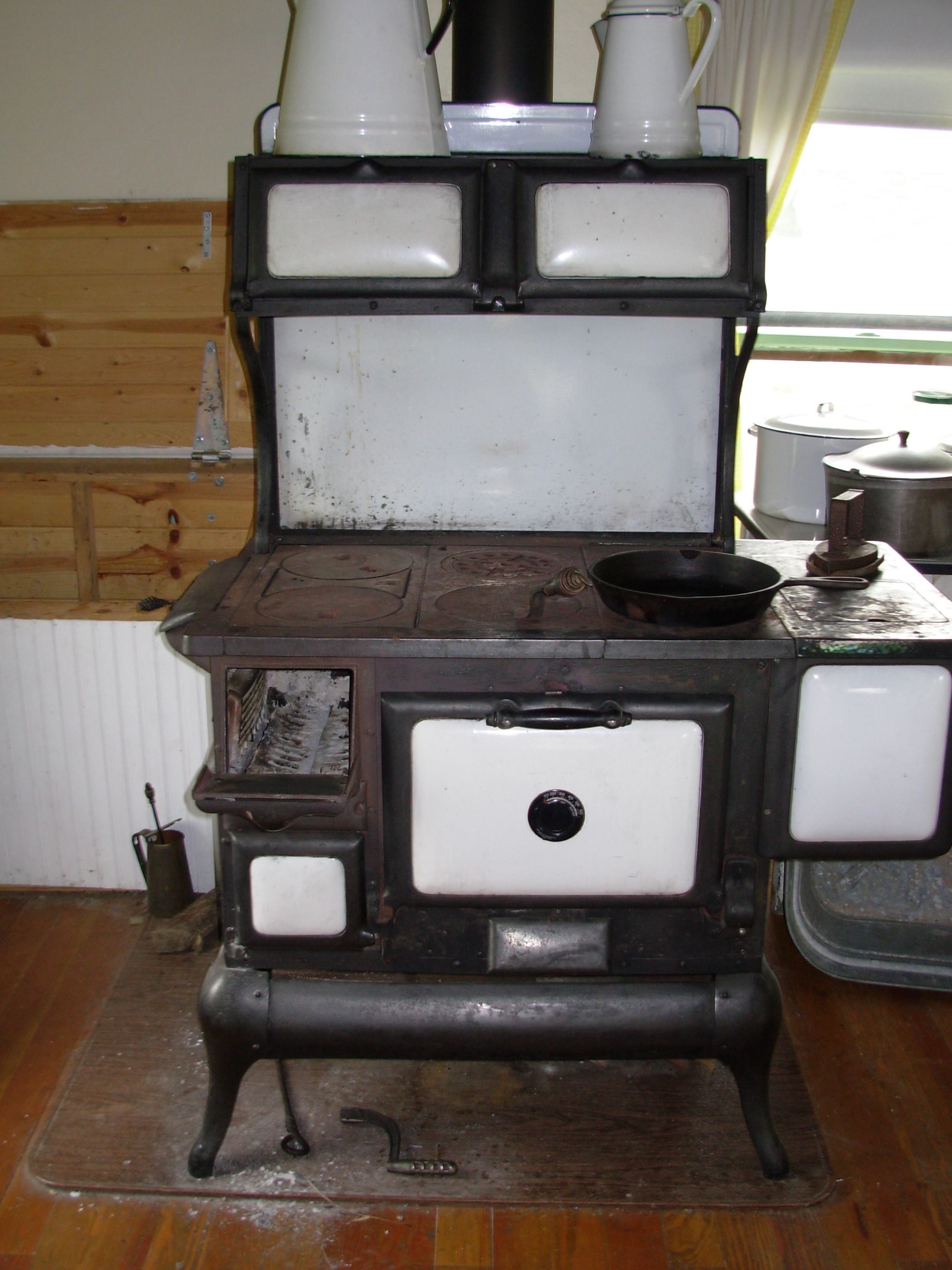 I had never cooked on a wood stove prior to 3 weeks ago and it is much easier than I had expected. The wood goes into the open door on the left and door below is to remove the ash which is dumped out by a hinged opening floor under the fire.
