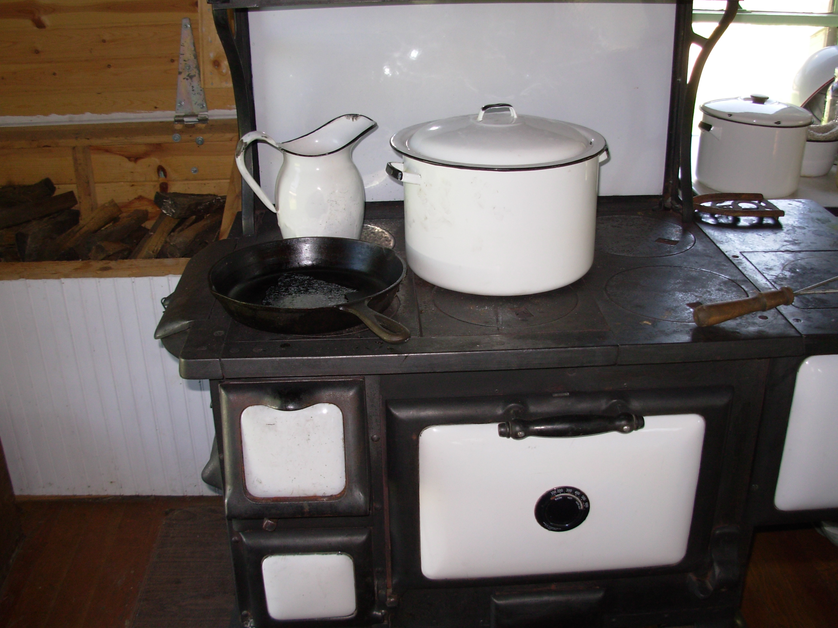 Back in the summer kitchen I got the stove going and let the berries soften over the warm area while I made some scrambled eggs over the hot firebox on the left. We also added some rhubarb, black raspberries, and unripe apples to hopefully give us enough pectin to make a good jell.