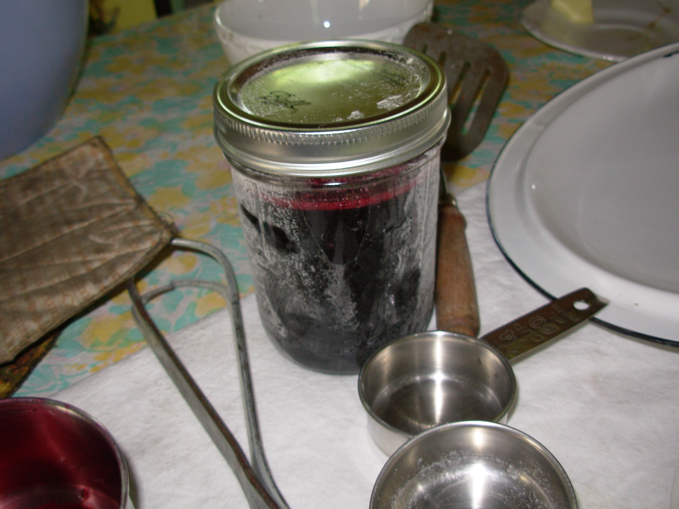 In the pot I smashed them up and let them warm awhile to release the juice. Then I strained everything through cheesecloth and got about two cups of juice. We didn’t really have a recipe for mulberries so made our best guess and added 1 1/3 cups sugar, then brought it to a rapid boil while stirring. The stove did beautifully here, I wish I had a picture but I was distracted with stirring and trying to avoid the heat pouring out of the stove (I still love the wood stove but it was hot). After 10 minutes or so it seemed thick enough and I poured it into a sterilized pint jar and capped so it would seal.